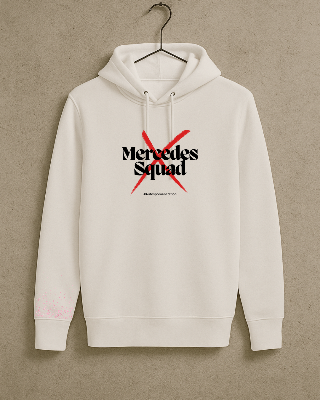 Отпред – минималистичен Mercedes Squad с червен X – ясен знак, че това не е масов merch.