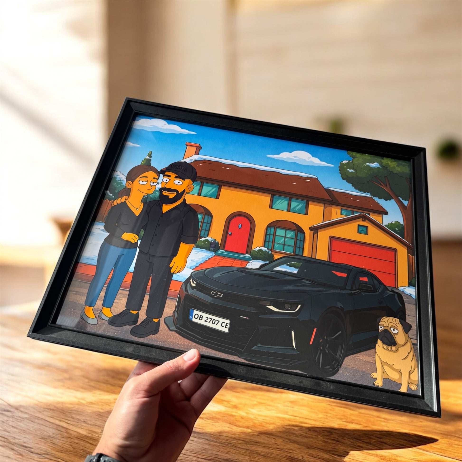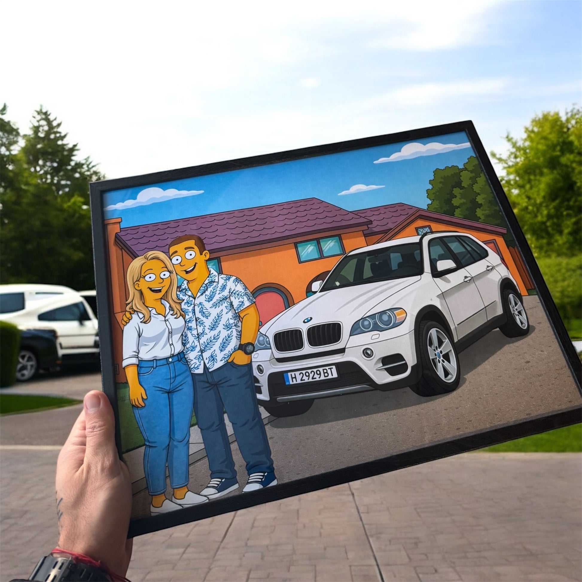 Създаваме персонализирана картина с теб, твоята половинка (или приятели) и колата, поставени в запомняща се, анимирана визия с характер.