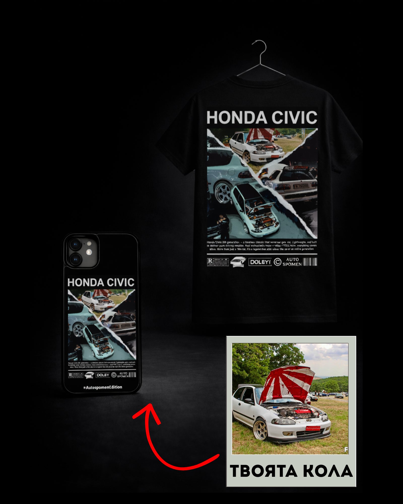Персонализираният комплект на Autospomen е тук — тениска + кейс с уникален дизайн по твоя автомобил.